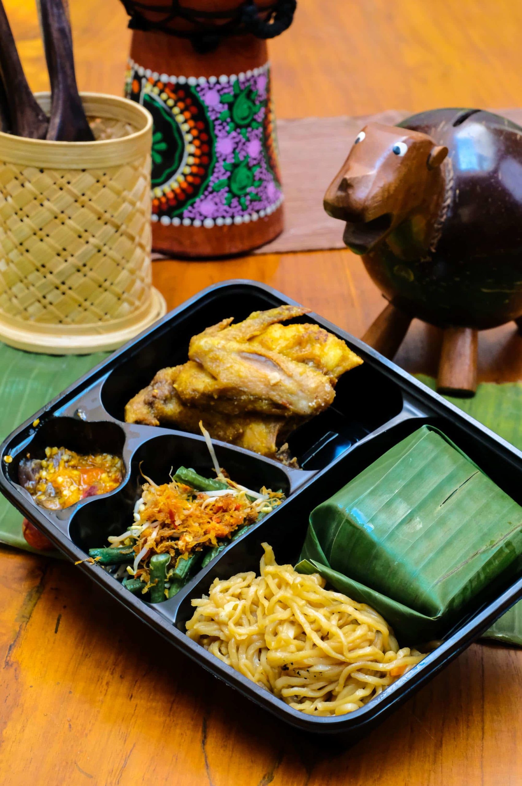 Nasi putih, ayam goreng, mie goreng, sambel goreng pete, urap-urap, sambel